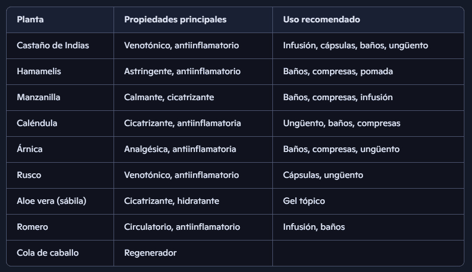 - Castaño de Indias: Mejora la circulación venosa y reduce la inflamación. Dosis: 300-500 mg de extracto estandarizado al día, según indicación profesional.